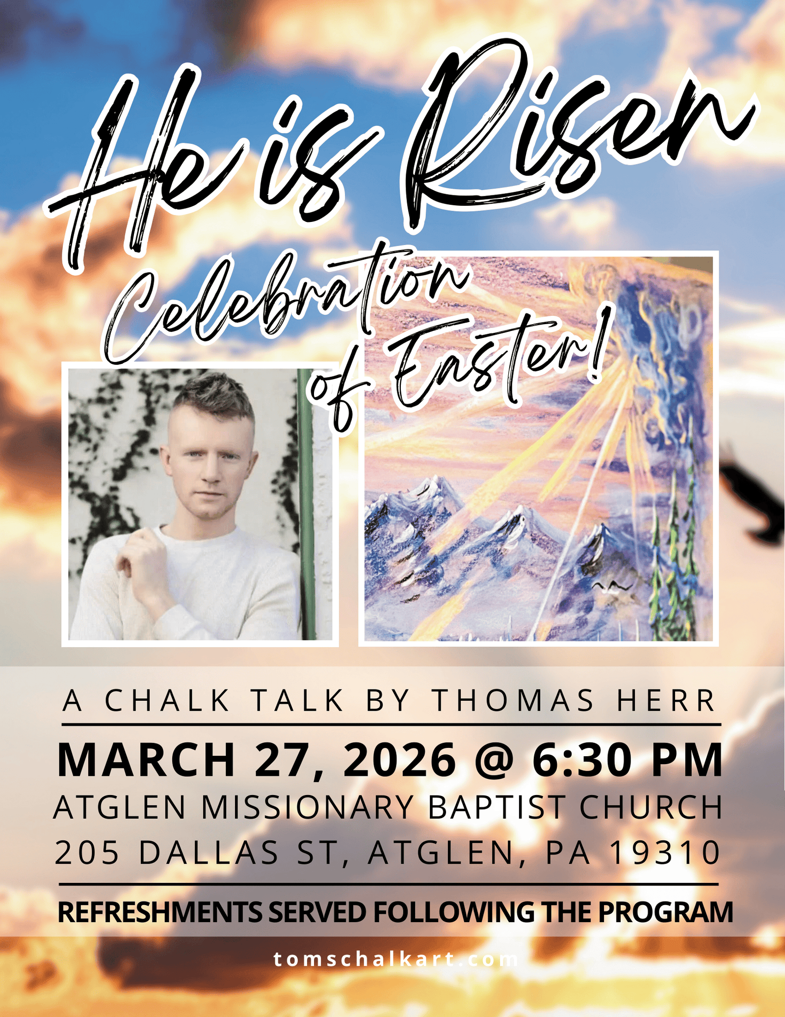 Thomas Herr is a visual artist who creates live chalk presentations that blend illustration and storytelling. He began developing his craft at age 10 and has presented programs for churches and events across Pennsylvania, Maryland, Virginia, and Massachusetts, as well as internationally in Haiti and Costa Rica. His chalk talks are designed to be visually engaging, message-driven, and accessible to audiences of all ages.